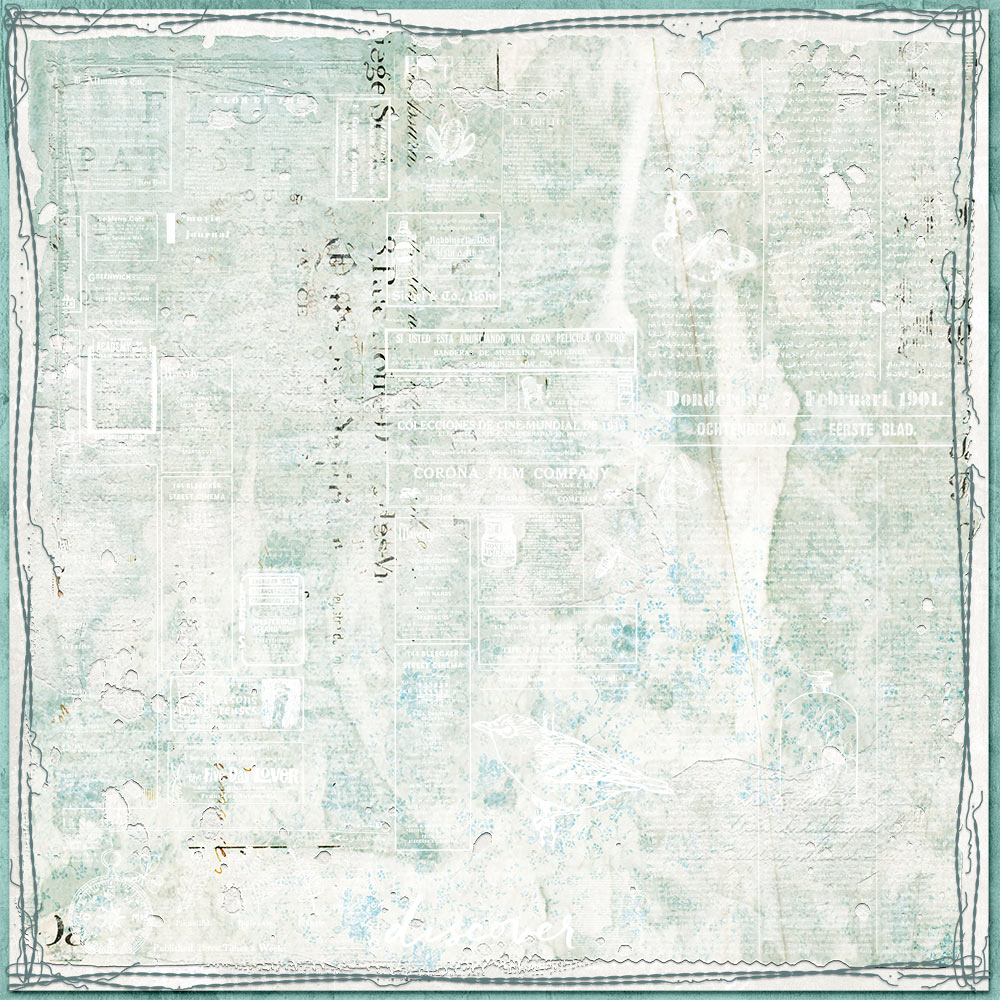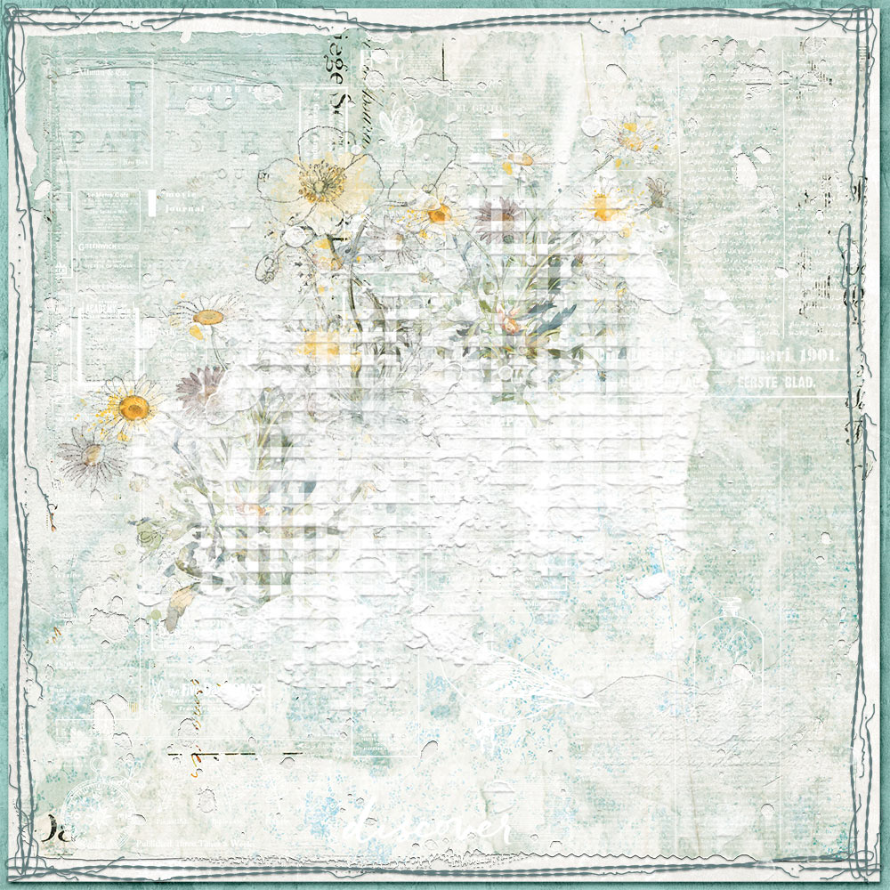 I then went into the kit to snatch up some transfers that I thought would recreate the look of gesso after filling them with white and again, adding a bit of bevel and emboss. I also grabbed a watery photo mask that I thought would look good as they have a softer look to them. I just filled it with white.