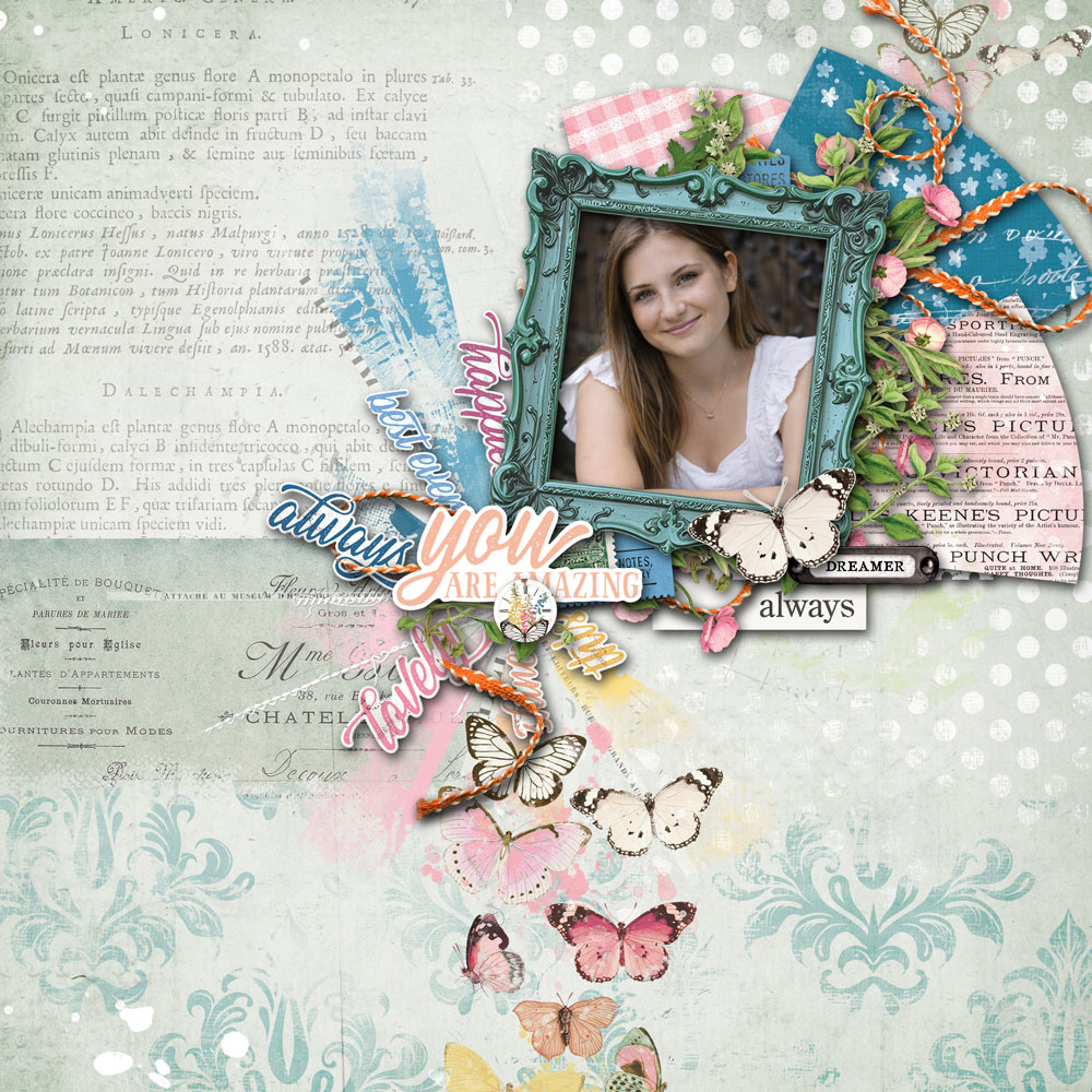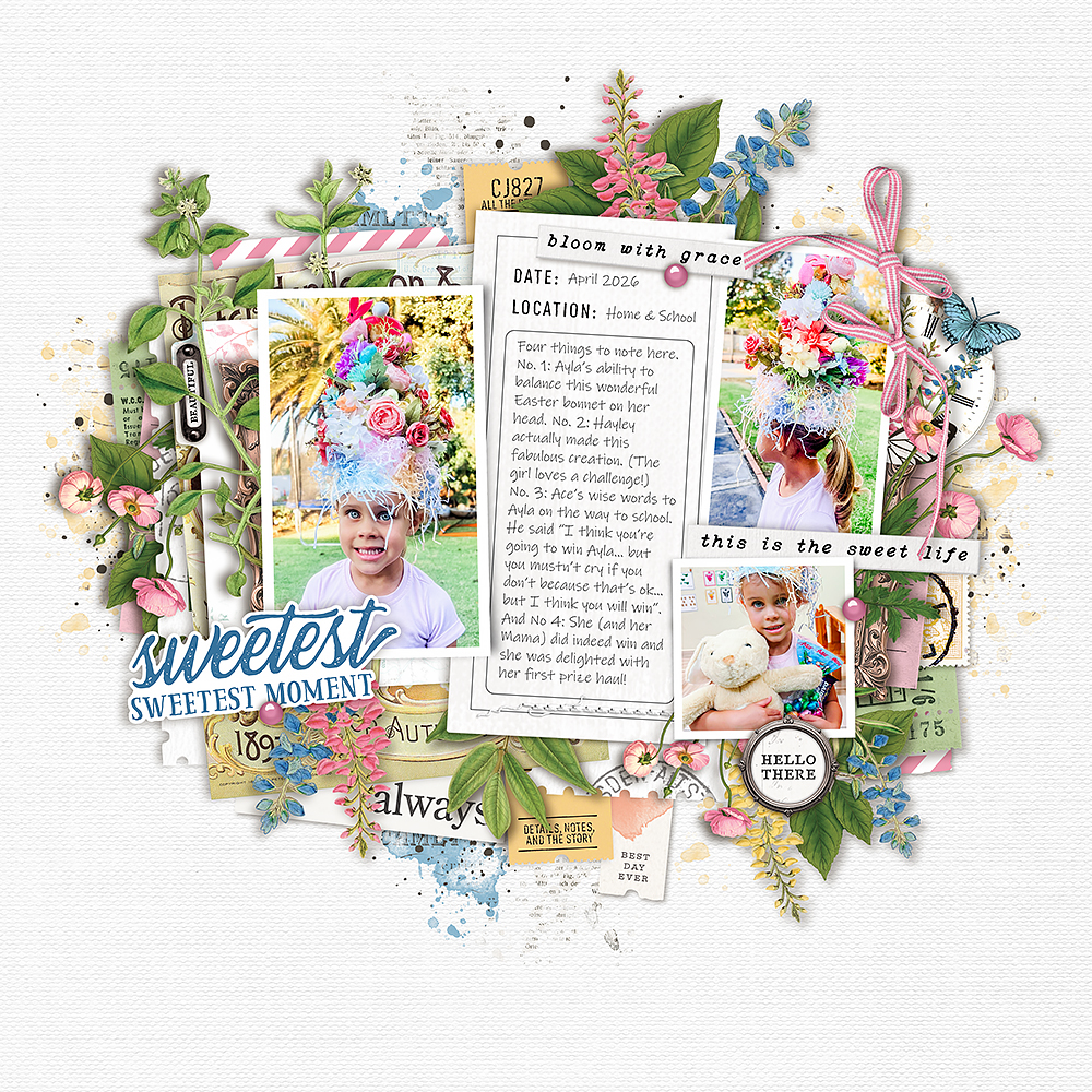 I (myssp) I created this layout with a photo of my darling granddaughter. This new kit was absolutely perfect for creating a scrumptious backdrop, packed with gorgeous elements that bring this fun photo to life—I was at a loss for words, so I chose a few!