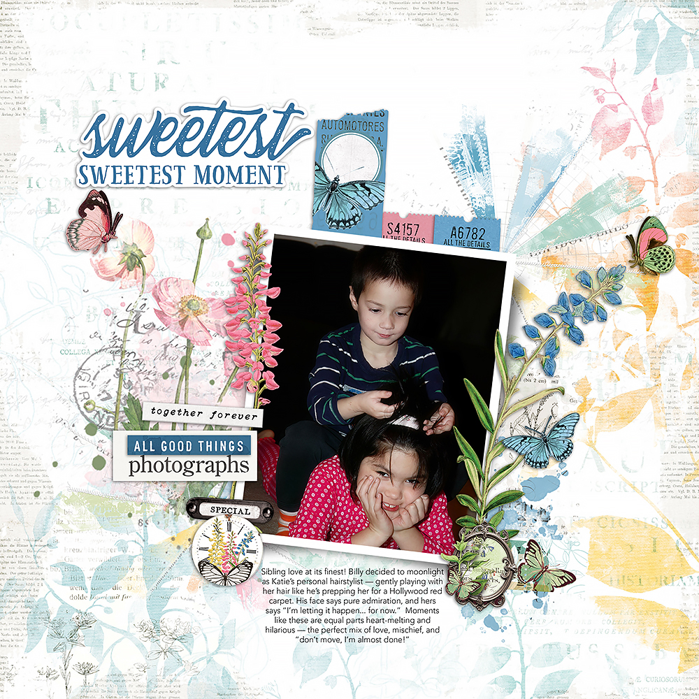 Guest Creative Team Member Penny (PennyH) has created a beautiful layout that captures sibling mischief at its finest. Her gorgeous use of this color palette, paired with stunning brushwork, brings this amazing photo to life. Love this so much!