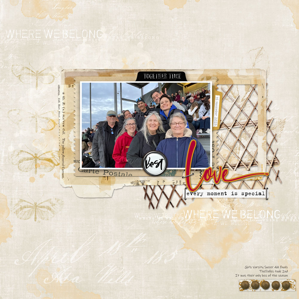 Our final inspiration page was designed by Merrilee (digigrandma.) She used this opportunity to highlight a special photo. The addition of her journaling in a column under the photo is eye catching.. I especially like Merrilee’s choice of a textured and pieced background. It is a lovely page! She completed her page with Chippy Foundation Paper Pack 02 and Duncan Solids Paper Pack.