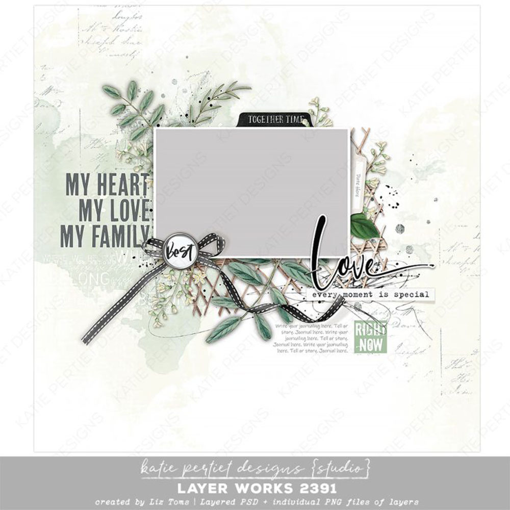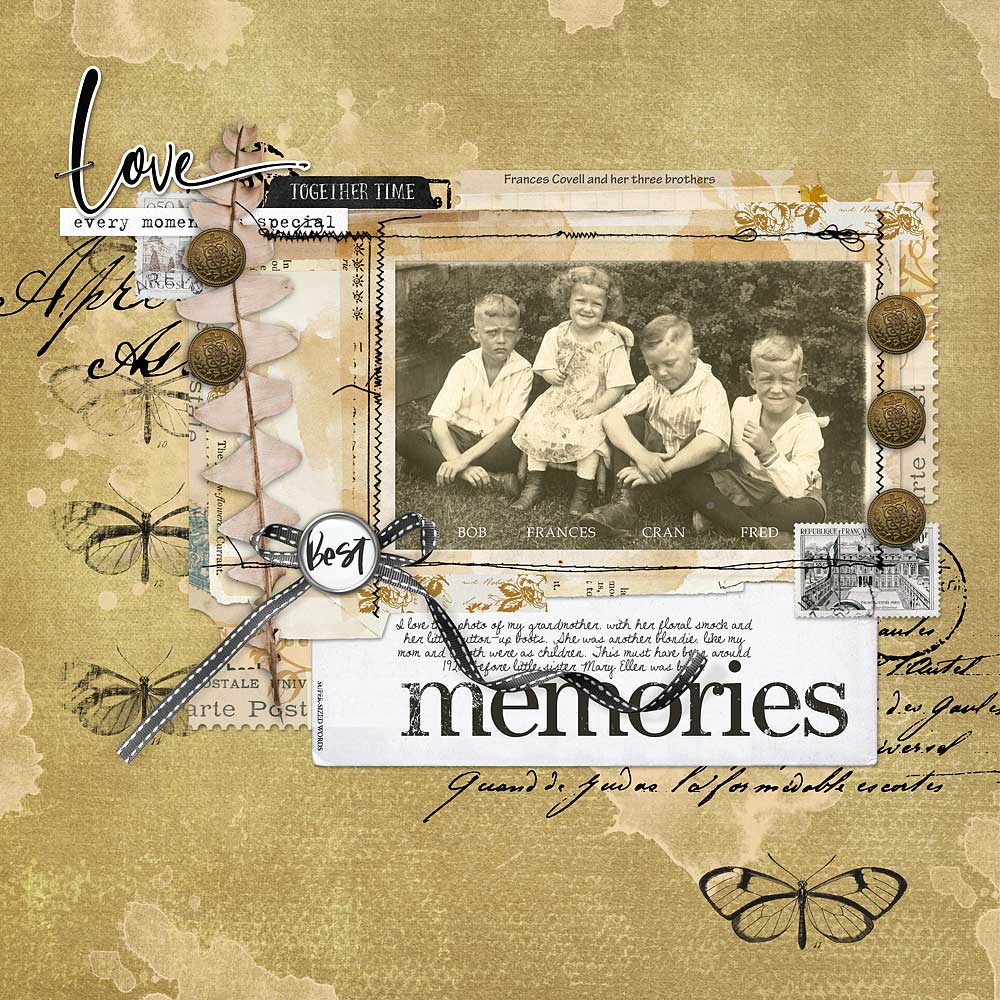The next inspiration page was designed by Candy (cnewby.) I like her choices of elements with texture to add interest and guide the eye across her page. She added a background paper from Lightly Linens Paper Pack 02.