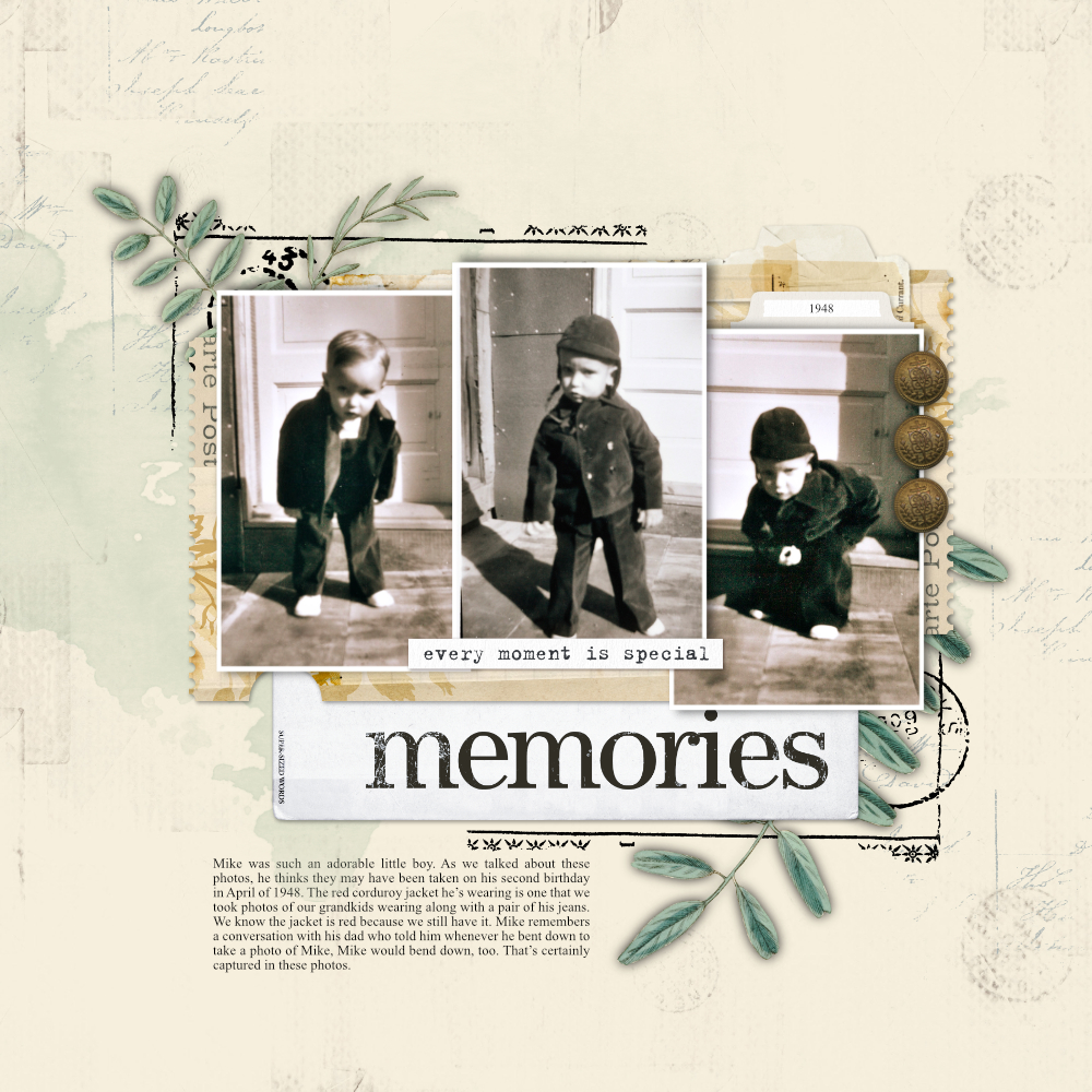 Look at the adorable photos on this page by Valerie (nana_vg.) She chose just the right elements to add interest to her page without taking the focus off her photos. I love the way she told the story of the corduroy jacket. Such a wonderful memory page! Valerie added a paper from Ancestry Solids Paper Pack for her background.