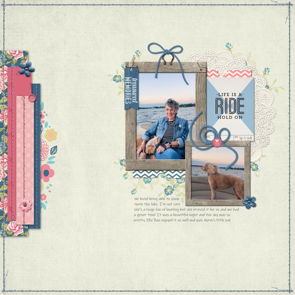 Cori (CoriK) created this beautiful layout documenting a boat trip. Lovely story! I love the strips of paper on the left that leads your eyes to the photos!