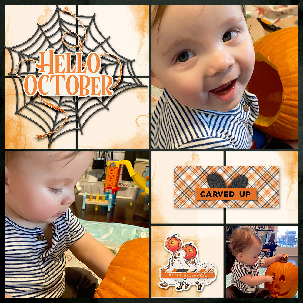 For the first example, I have used one of Katie’s many grid templates. There are many types of these in the shop and most Project Life creators use this format. This is my newest, sweet grandson Jett, who just celebrated his first pumpkin massacre, and he enjoyed every minute of it.