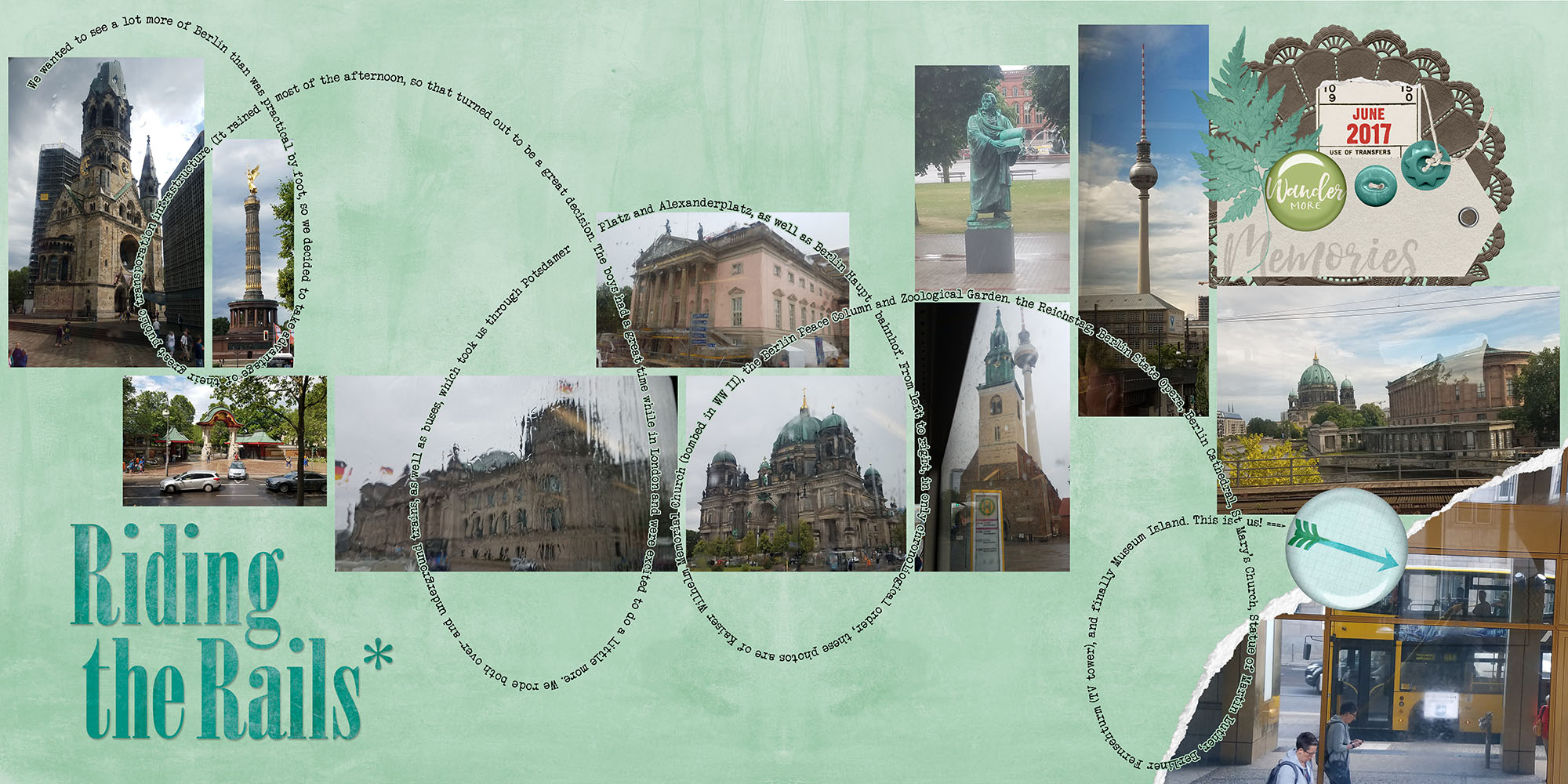 Kimberly‘s double page is amazing with the twisting text! What fabulous leading lines telling the story of their trip to Berlin. The arrow at the end of the loops points to them riding the bus, so fun!