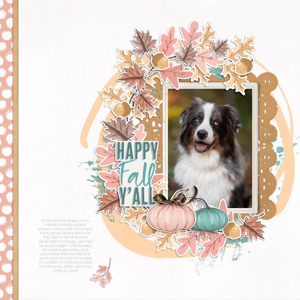 Supples Addie used: Autumn Winds Element Pack, Nature Study Stamp Pack, Artsy Leaves Transfers 02, Big Bottom Lift Classic Frames 03, Lifted Leaves 01, Messy Painted Circles 01, Letter Box Pattern Clusters Brushes and Stamps 02, Terra Botanica Solids Paper Pack.