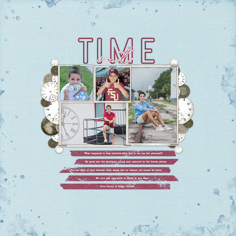 First up is Linda, who scrapbooked one of my favorite subjects of hers: her grandson Sam! I have watched this handsome young man grow up through Linda’s pages, and I was delighted to see her photos of him over the years. What a fabulous idea for a page about time, and her clock borders are the perfect symbols!