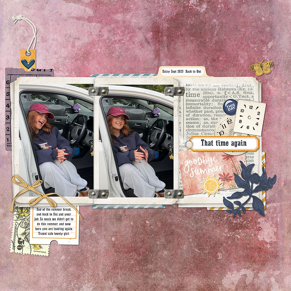Next up is Mel who used the time theme to illustrate a poignant moment: her daughter returning to university. As a mother, I remember that feeling well. I love how Mel picked up the magenta and navy tones from the sweet photos; the sunny pops of yellow tell me that she is happy for her daughter’s success and looking forward to their next meeting! Such a sweet and lovely page!