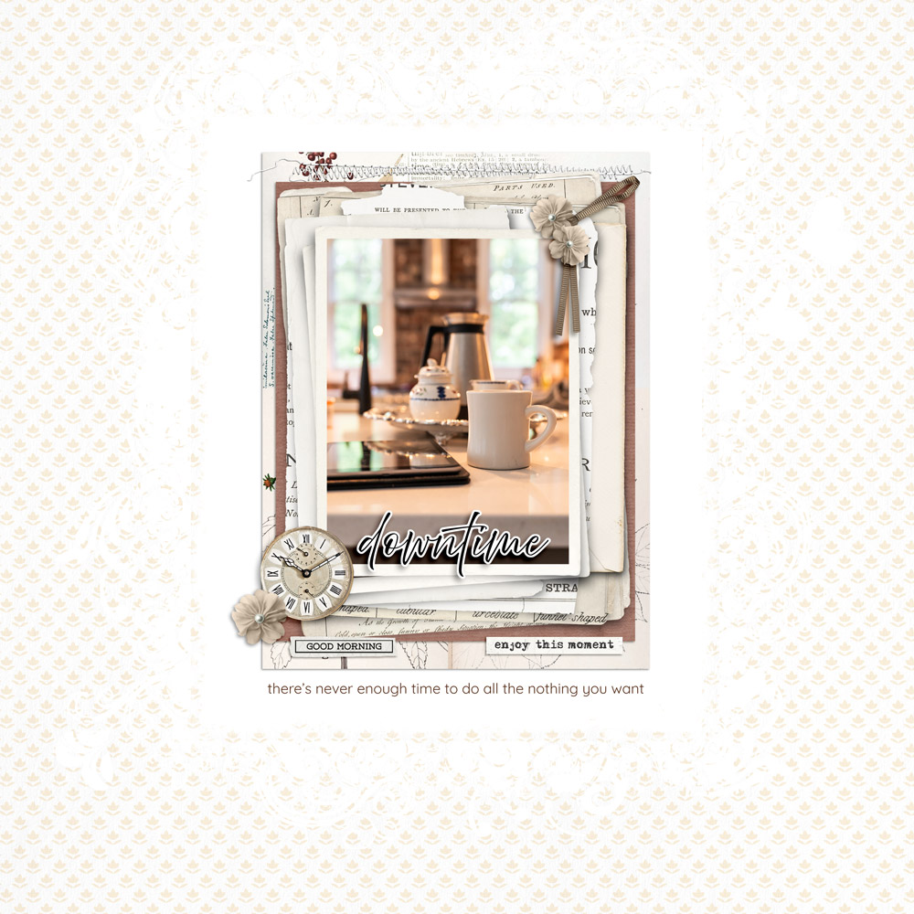 This month’s challenge is to use a clock on your page. Katie’s clocks are some of my favorite embellishments; they are especially beautiful in clusters. There are clocks available in this challenge’s freebie (see below). You could use the Clock Parts or Time Clusters series shown here or any number of standalone clocks in her kits. Some page ideas I thought of: