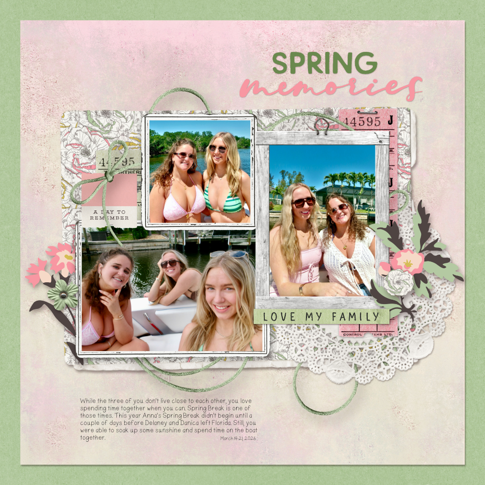 Valerie (nana_vg) created this beautiful layout documenting some Spring Break memories. I love the pink and green that pulls out the colors of the photos perfectly. The shadowing of her elements are perfect!