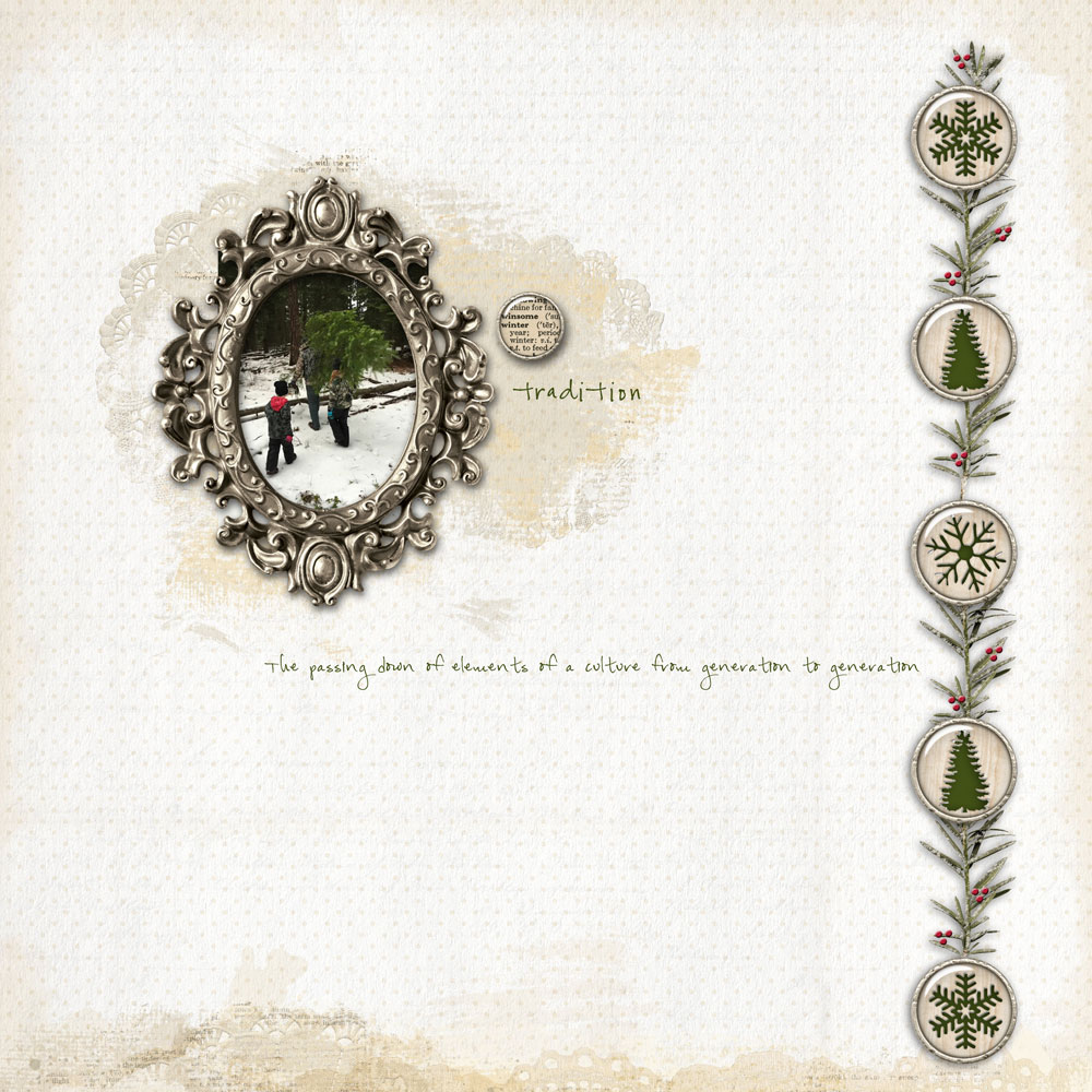 First up Candy (cnewby) created this wonderful layout showcasing the picking of a Christmas tree. I love how she framed the photo and the strip of elements along the side of the page.