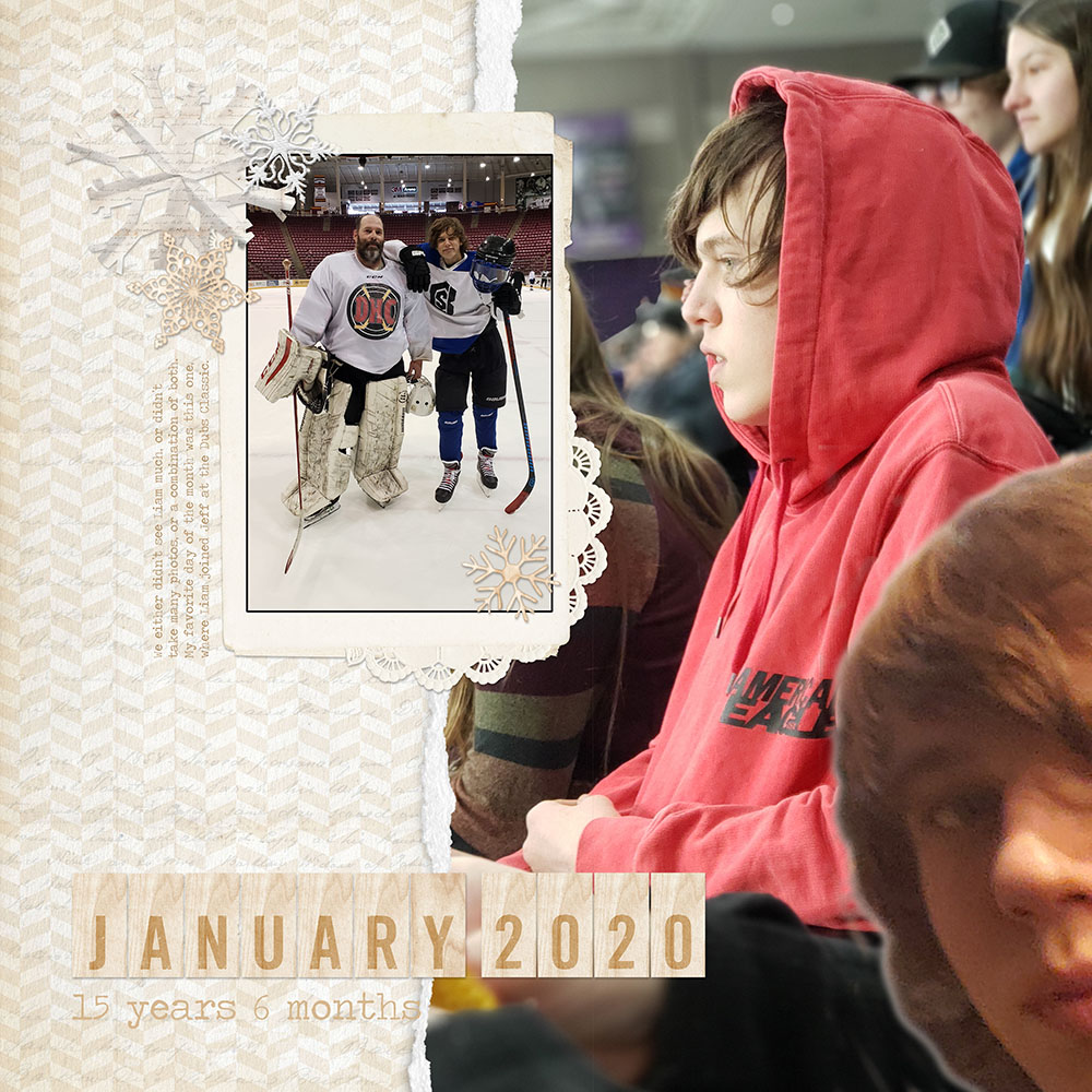 Kimberly (kimberlyb) created a double layout and also this single layout of some hockey. I love the torn paper and the title and the snowflakes around the layout! Beautiful!!