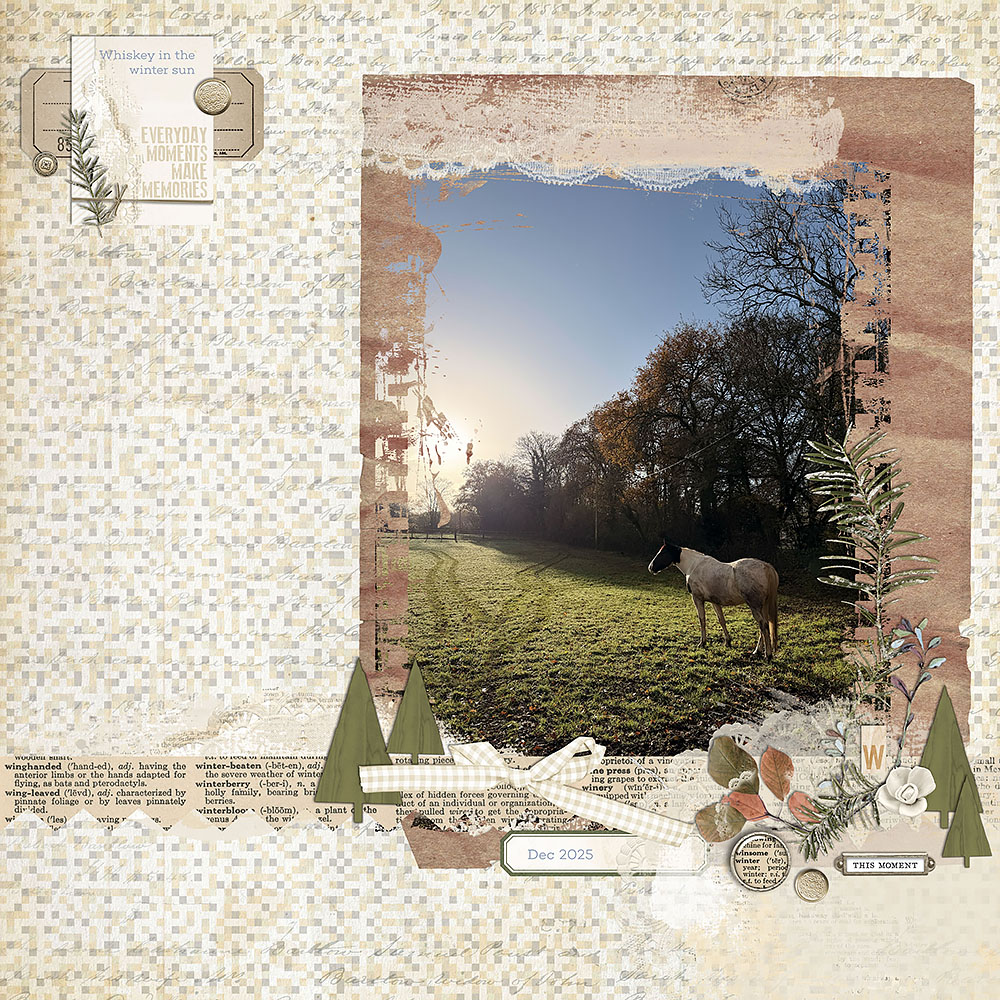Next up Mel (Britgirl) created this layout of one of her beautiful horses! Even tho her photo has no snow the kit was perfect to document this photo. I just love how she framed this photo and all her elements are perfectly arranged!