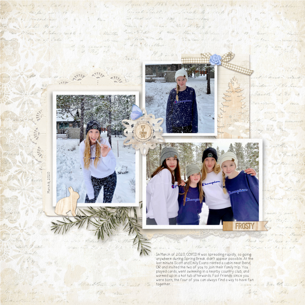 The challenge is simple, use the kit or collection to make a layout. With this particular kit a photo of snow, winter or even a Christmas ornament or a tree lit up would work perfectly with the muted tones of this collection. If you need to use an item or 2 from your stash that is ok as long as your layout highlights the Frosted Winter Kit or Frosted Winter Collection.
