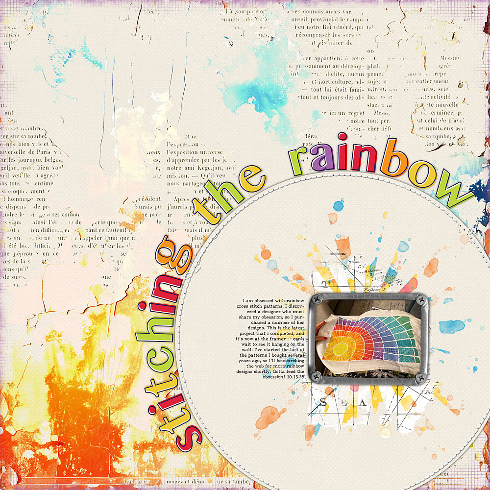 This last page is mine. I didn’t go with the rainbow colors, but I loved the circle in the corner approach! I had so much fun playing around with it.