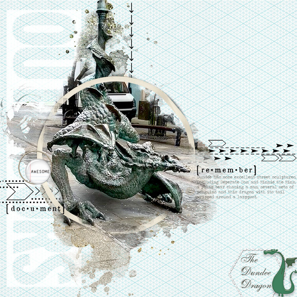 Time to share a few other pages to inspire your scraplifting. Up first is Chrissy (kikimama) with a clever dragon page. She used a similar spill frame and graphic brushes. I love her subtle graphic title as well.