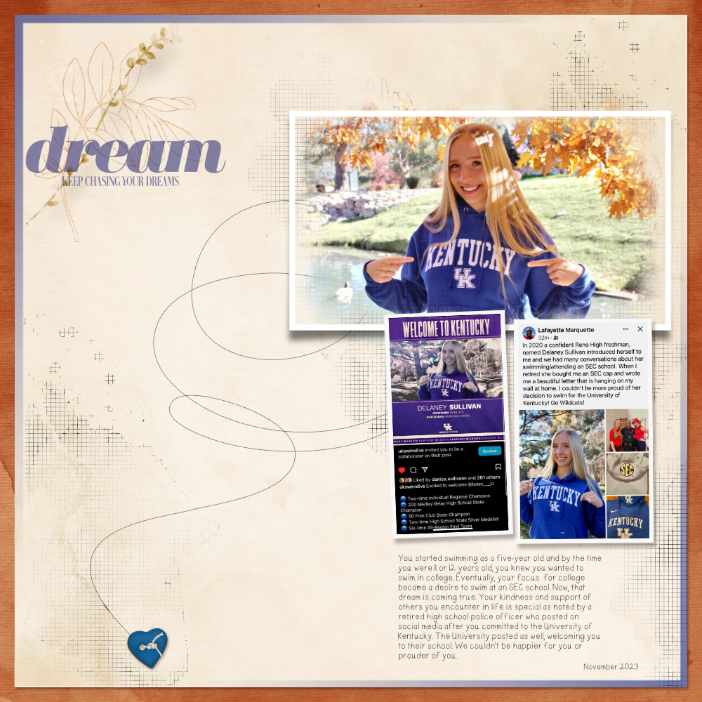 Valerie (nana_vg) went with the basic layout of the page but used multiple photos to celebrate her granddaughter’s college selection. Love her title and the heart accent.