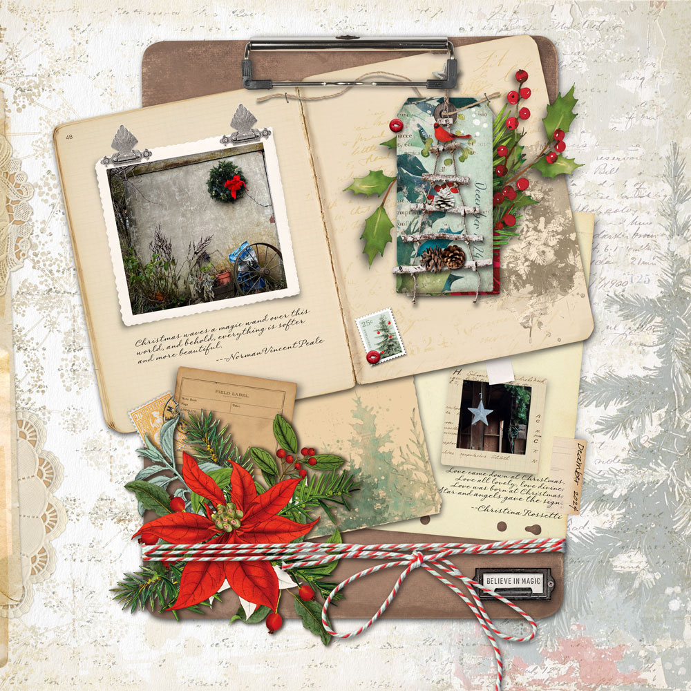 Clipboard Memories Layered Template 02, Frosted Winter Paper Pack, Chippy Christmas Paper Pack 02, Letter Box Remnants Stamp Pack 03, Curated Studio Mix 46
