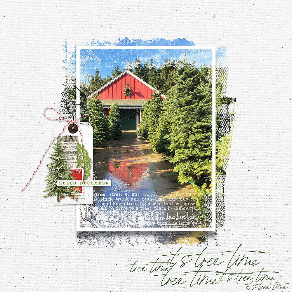 Happy Saturday! Tis the season for a seasonal scraplift. I was drawn in to Kate’s page immediately. The photo is stunning (that reflection!) but I also really loved the tag she built and that is what I chose to focus on this week. Of course, as with all scraplifts, please take inspiration from wherever you like!
