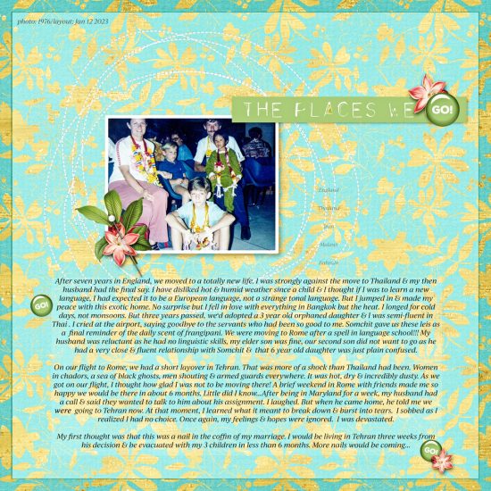 Wow, just wow, Maureen has had some humdingers of new beginnings in places she has lived. Gasping as I read her story, it’s truly amazing. I’m glad she was able to get this down, and what pretty background paper I think perfect for the Thailand part of her amazing story.