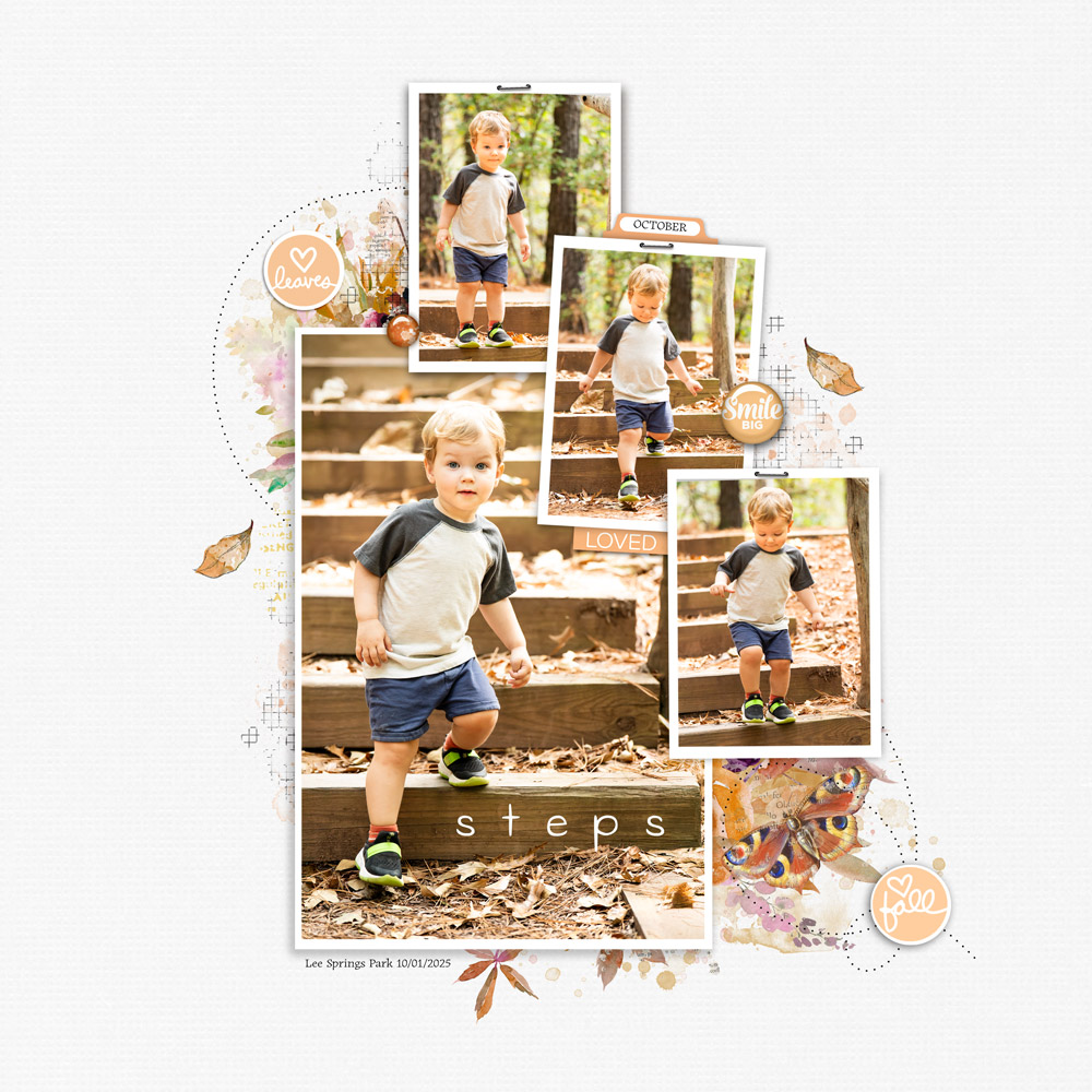 First up is Amy’s page. She chose to use soft, fall colors to match the series of photos of her little grandson navigating a row of steps with careful determination. Precious! The background Paper is Arctic Whites 04 Pack Pack.