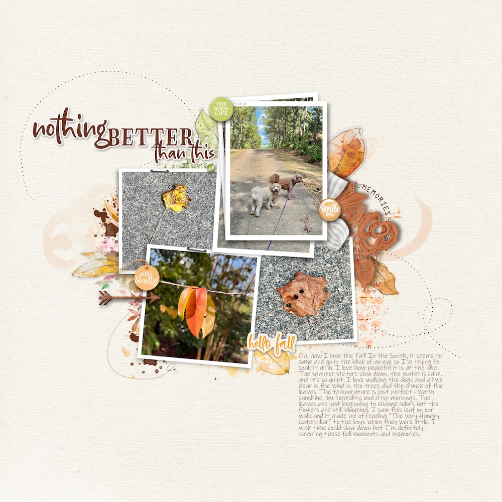 On Cori’s delightful page we get to see beautiful closeup photographs of individual fall leaves, plus her cute dogs out for a fall walk. I love the bow tucked in with the photo cluster. A paper from Anzio Solids Pack completes her Mashup.