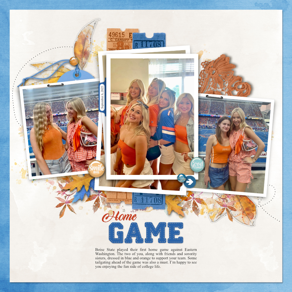 Next, Valerie created a bold color scheme to match the outfits in school colors her granddaughter and her friends are wearing at a recent football game. So fun! The coordinating papers are from Palette Textures Paper Pack 10 and Palette Textures Paper Pack 30.