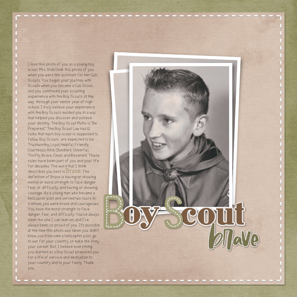I, Valerie (nana_vg), found this photo of my husband when he was a Boy Scout. That and the word “brave” are perfect for me to describe how his boy scout experience impacted his future life.