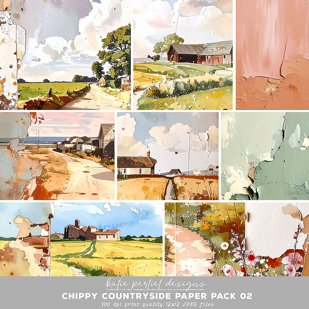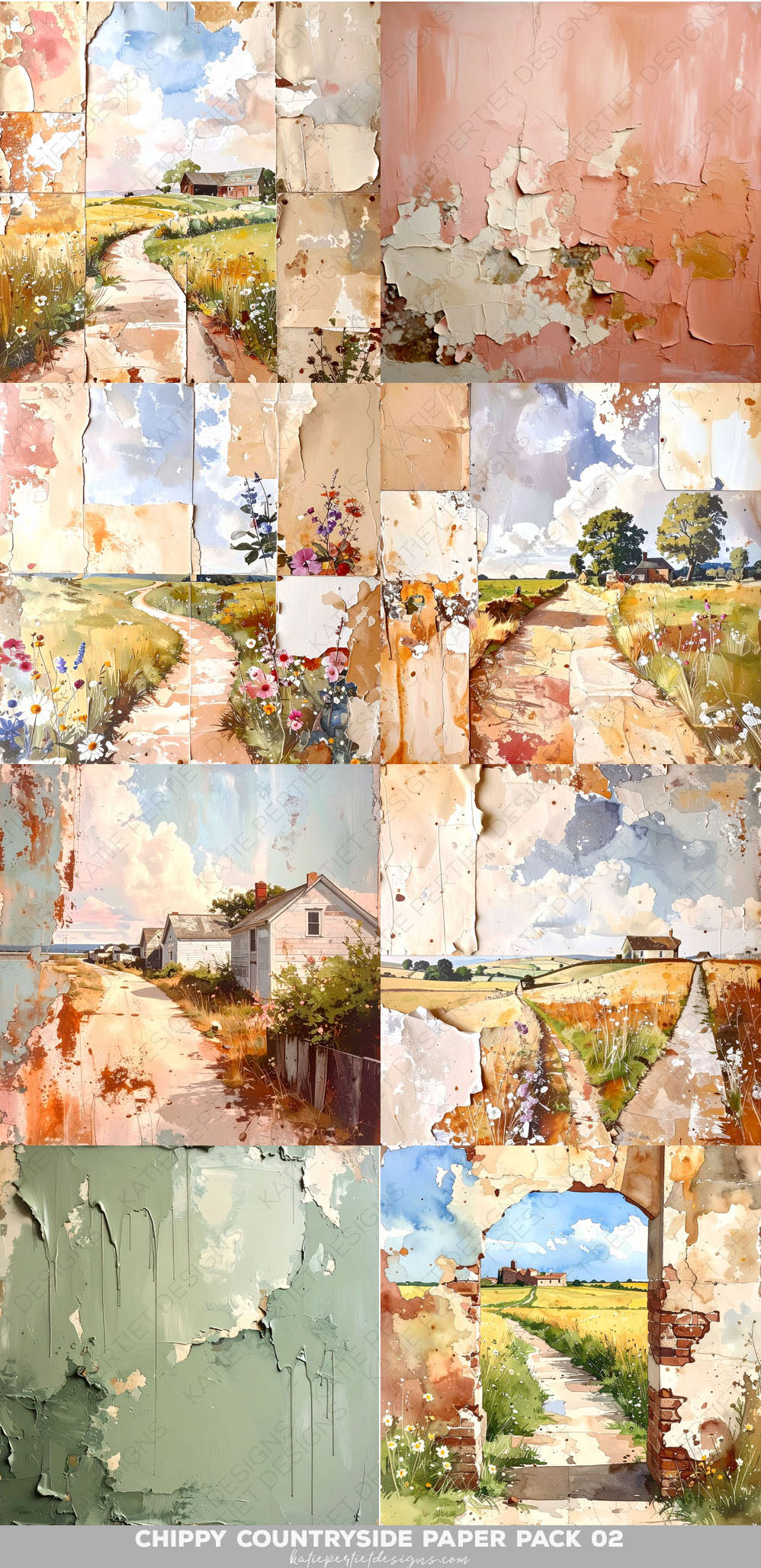 8 designer artsy collaged papers with scenes of the countryside. All 300dpi 12×12 JPEG files. File Size: 12MB
