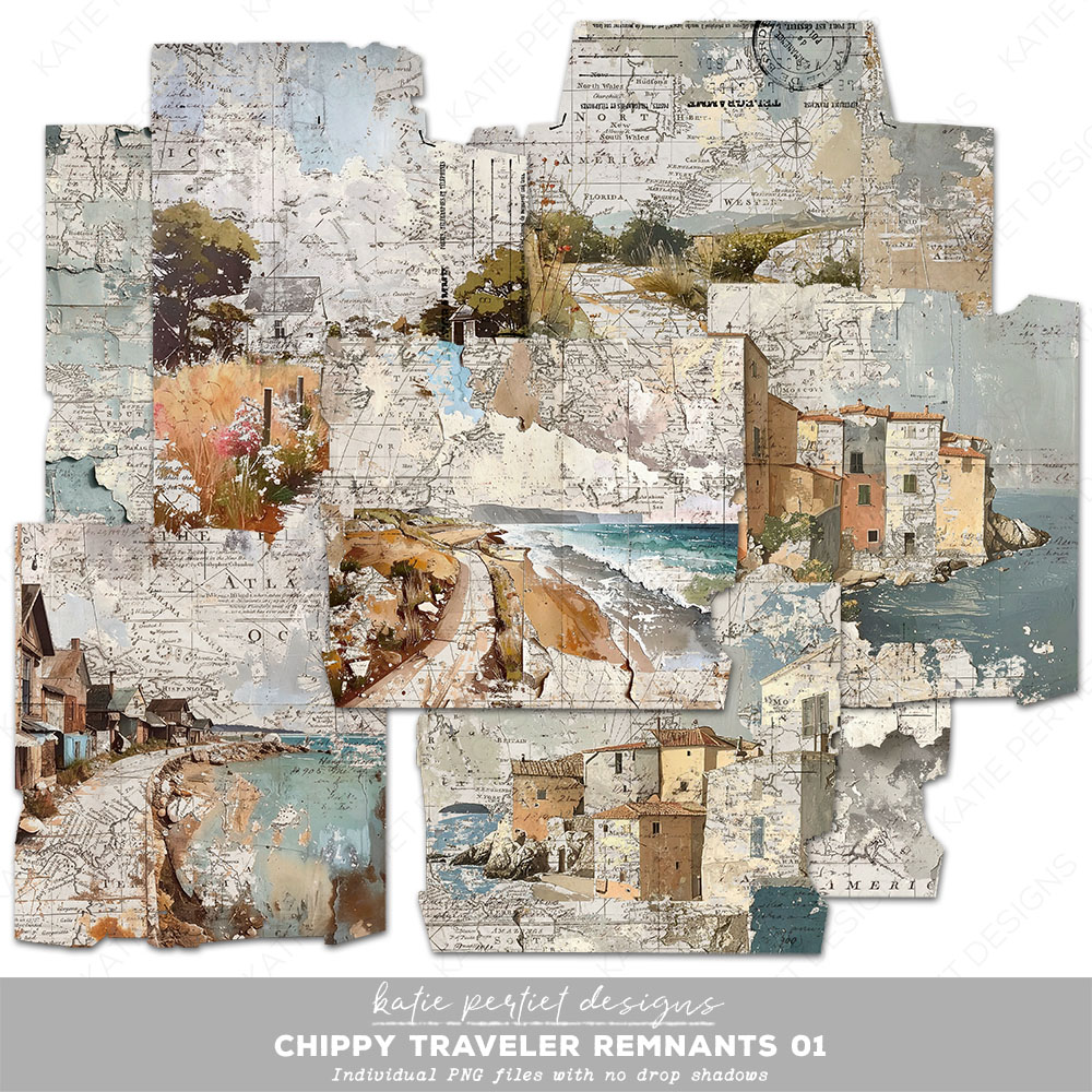 8 worn and torn Chippy Traveler papers of collaged maps and coastal destinations. Individual PNG files with no drop shadows. File Size: 105MB