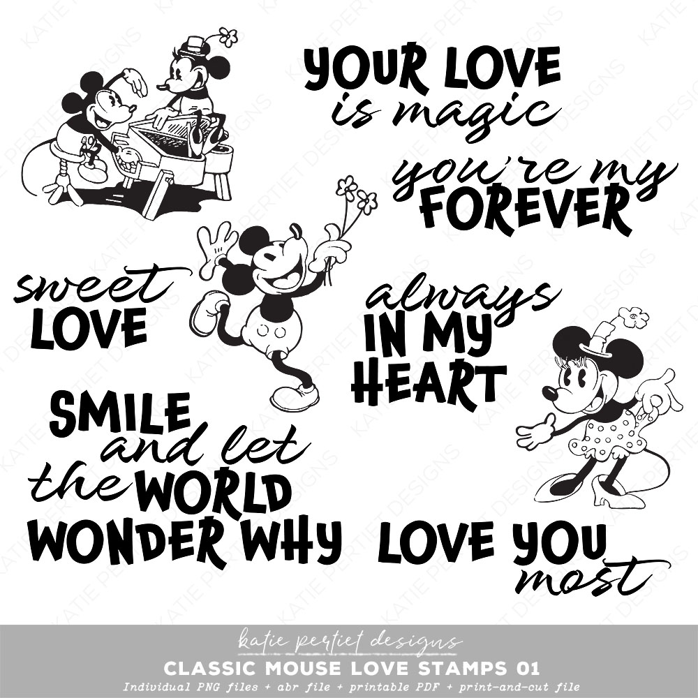 6 Love-filled sentiments and 3 classic mouse illustrations for a sweet stamp pack. Includes individual PNG files, abr file, printable PDF and print-and-cut files. File Size: 5MB