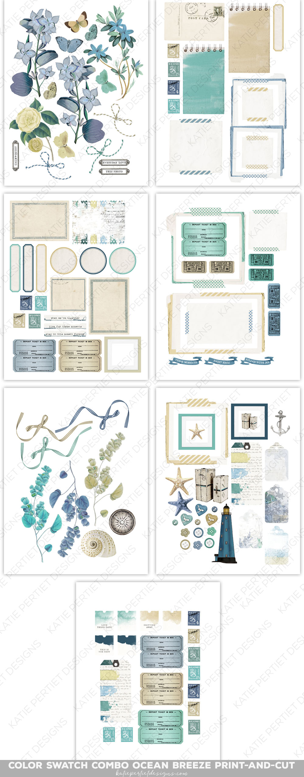 A mix of Color Swatch Combo Ocean Breeze Ephemera optimized for easy print and cut. Includes individual PNG files for digital and no drop shadows. Also included are PDF sheets for fussy cutters and PNG sheets with transparent backgrounds ready to drag, drop and scale in your print and cut app. File Size: 140MB