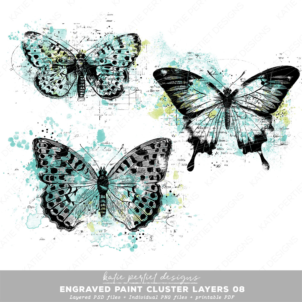 3 Layered PSD clusters of vintage engravings, writing, text and ledgers mixed with paint splashes. Composite PNGs, PNGs of individual layers and a printable PDFs are also included. File Size: 70MB