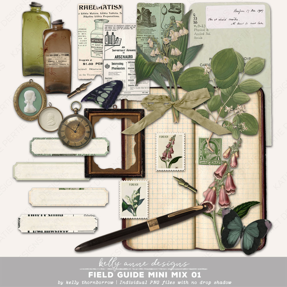 A mix of vintage and field guide themed elements. Individual PNG files with no drop shadows. File Size: 25MB