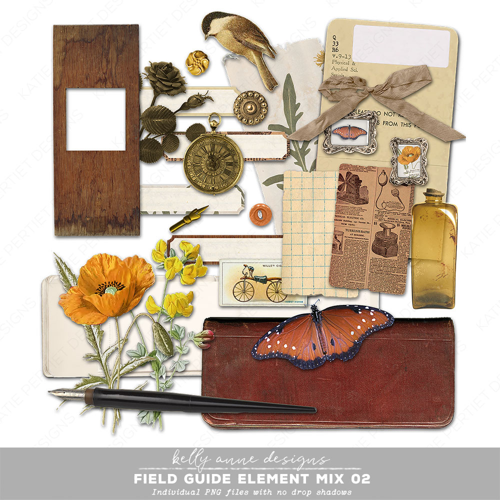 A mix of vintage and field guide themed elements. Individual PNG files with no drop shadows. File Size: 25MB