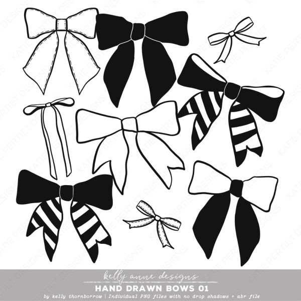 8 Hand drawn bows to adorn your projects and pages with. Individual PNG files and an .abr file. File Size: 2MB