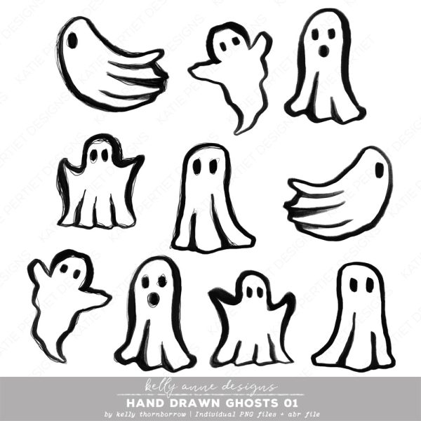 10 Handdrawn freestyle and sketchy ghosts. Individual PNG files and an .abr file. File Size: 5MB