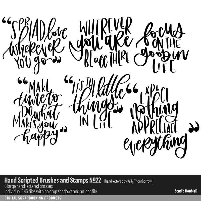 6 Hand lettered quote stacks and phrases. Individual PNG files and an .abr file. File Size: 3MB