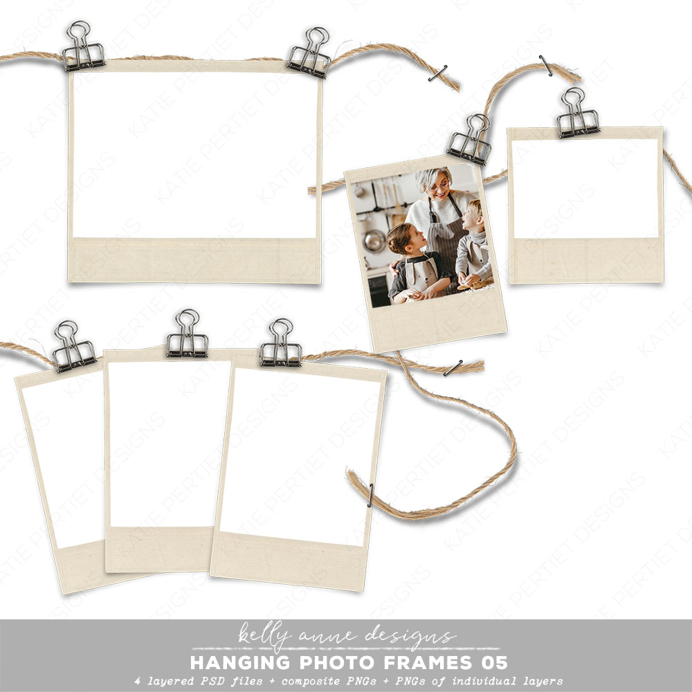4 Clipped and hanging photo frames. Provided in layered PSD formats for easy photo placement as well as composite PNG files and PNGs of individual layers. File Size: 40MB