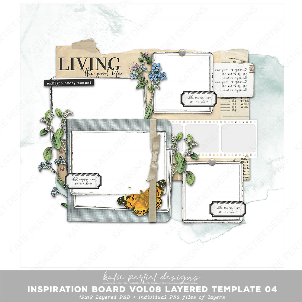 The inspiration board templates are a series of pages that help you pull together a mix of memories into a creative page design. Packed with everything you need, it’s more of a pre-designed page than a template. Simply add your papers, photos and journaling and you’re done! Layered Adobe PSD file and individual PNGs of each layer. File Size: 75MB