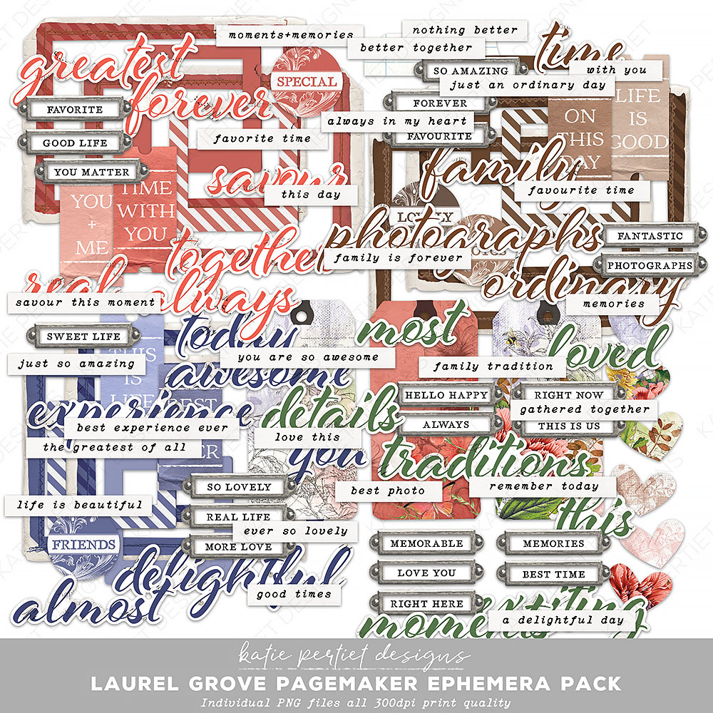 Designed as a paper collection for Arden Creative Studio and now available in digital. Includes 100+ embellishments including titles, sentiments, tags and photo frames. Individual PNG files with no drop shadows. File Size: 25MB
