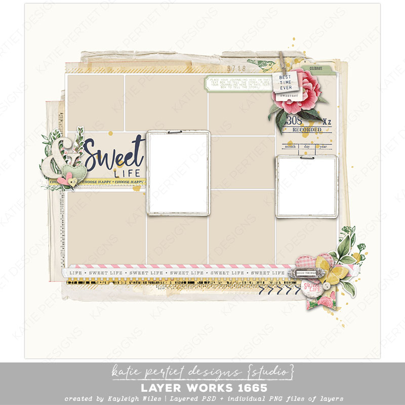 A delightful layout by Kayleigh Wiles with elements from Katie Pertiet. Packed with everything you need, it’s more of a pre-designed page than a template. Simply add your papers, photos and journaling and you’re done! Layered Adobe PSD file and individual PNGs of each layer. File Size: 56MB