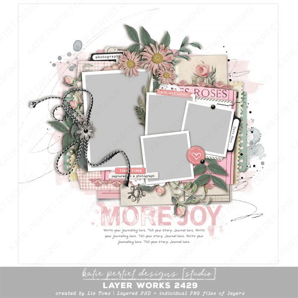 A delightful layout by Liz Toms with elements from Katie Pertiet. Packed with everything you need, it’s more of a pre-designed page than a template. Simply add your papers, photos and journaling and you’re done! Layered Adobe PSD file and individual PNGs of each layer. File Size: 125MB