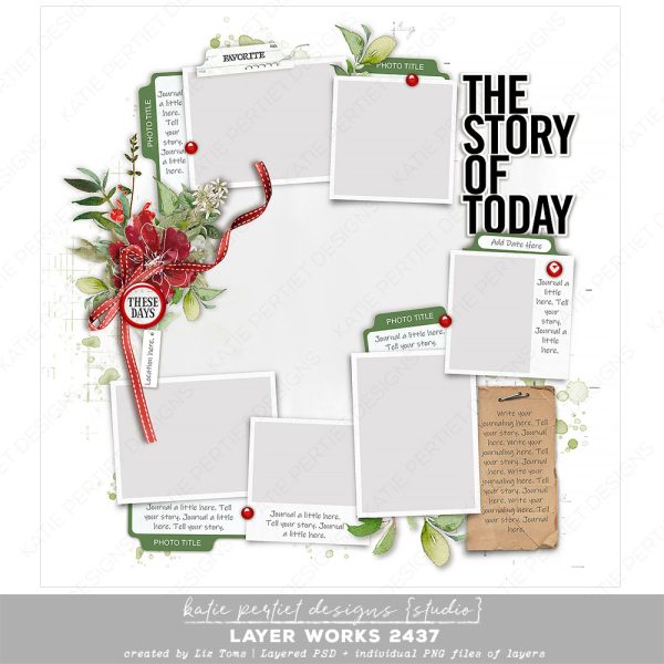 A delightful layout by Liz Toms with elements from Katie Pertiet. Packed with everything you need, it’s more of a pre-designed page than a template. Simply add your papers, photos and journaling and you’re done! Layered Adobe PSD file and individual PNGs of each layer. File Size: 50MB