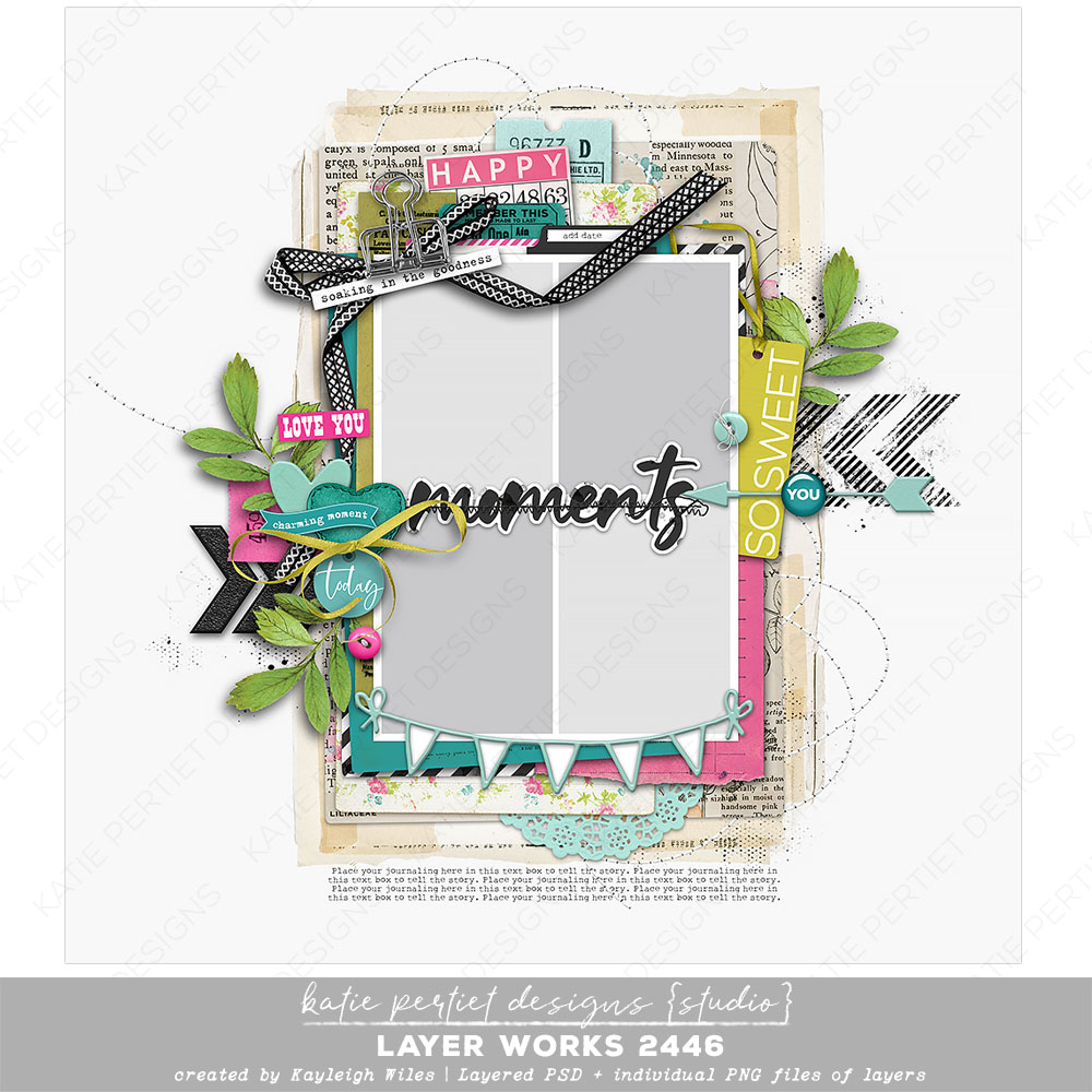 A delightful layout by Kayleigh Wiles with elements from Katie Pertiet. Packed with everything you need, it’s more of a pre-designed page than a template. Simply add your papers, photos and journaling and you’re done! Layered Adobe PSD file and individual PNGs of each layer. File Size: 95MB