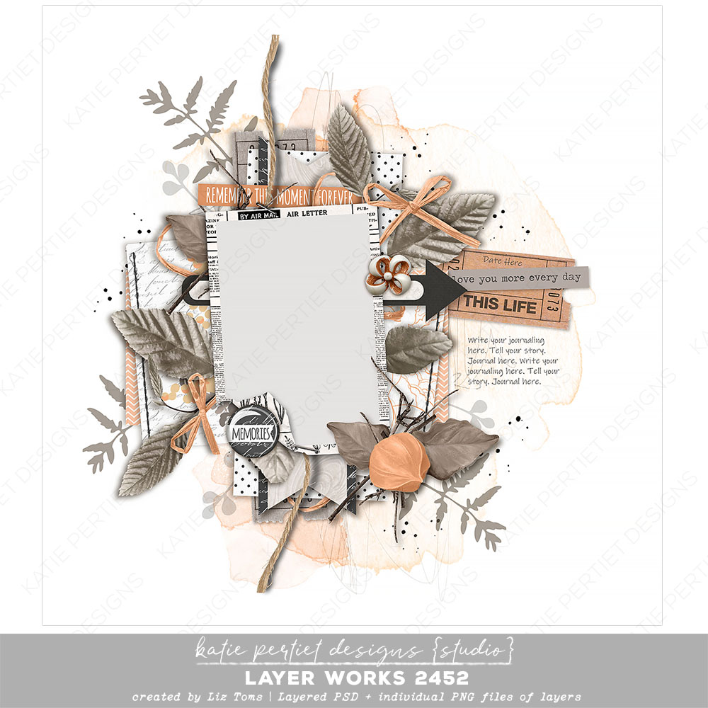 A delightful layout by Liz Toms with elements from Katie Pertiet. Packed with everything you need, it’s more of a pre-designed page than a template. Simply add your papers, photos and journaling and you’re done! Layered Adobe PSD file and individual PNGs of each layer. File Size: 80MB