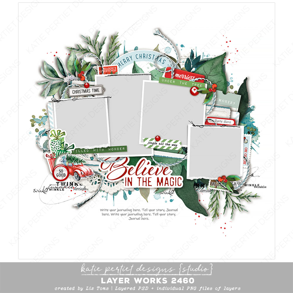 A delightful layout by Liz Toms with elements from Katie Pertiet. Packed with everything you need, it’s more of a pre-designed page than a template. Simply add your papers, photos and journaling and you’re done! Layered Adobe PSD file and individual PNGs of each layer. File Size: 95MB