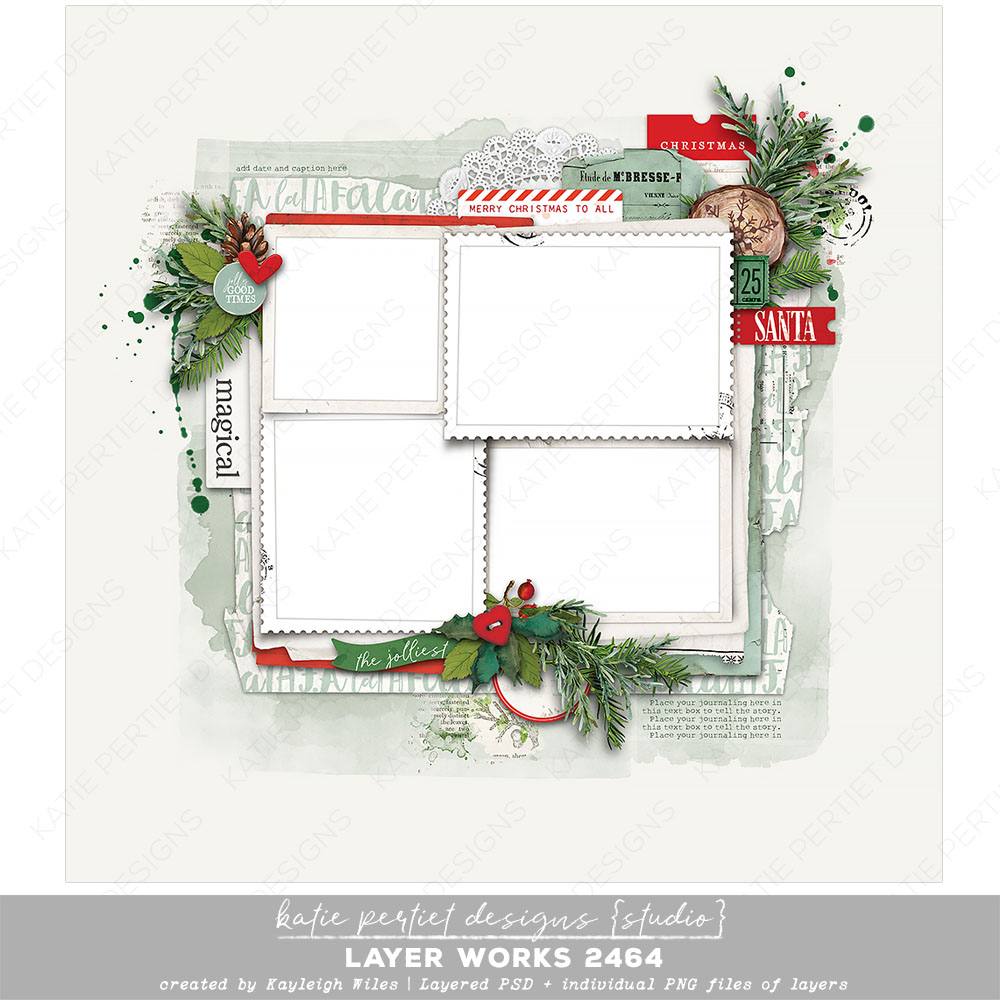 A delightful layout by Kayleigh Wiles with elements from Katie Pertiet. Packed with everything you need, it’s more of a pre-designed page than a template. Simply add your papers, photos and journaling and you’re done! Layered Adobe PSD file and individual PNGs of each layer. File Size: 90MB