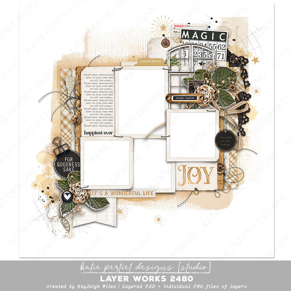 A delightful layout by Kayleigh Wiles with elements from Katie Pertiet. Packed with everything you need, it’s more of a pre-designed page than a template. Simply add your papers, photos and journaling and you’re done! Layered Adobe PSD file and individual PNGs of each layer. File Size: 125MB