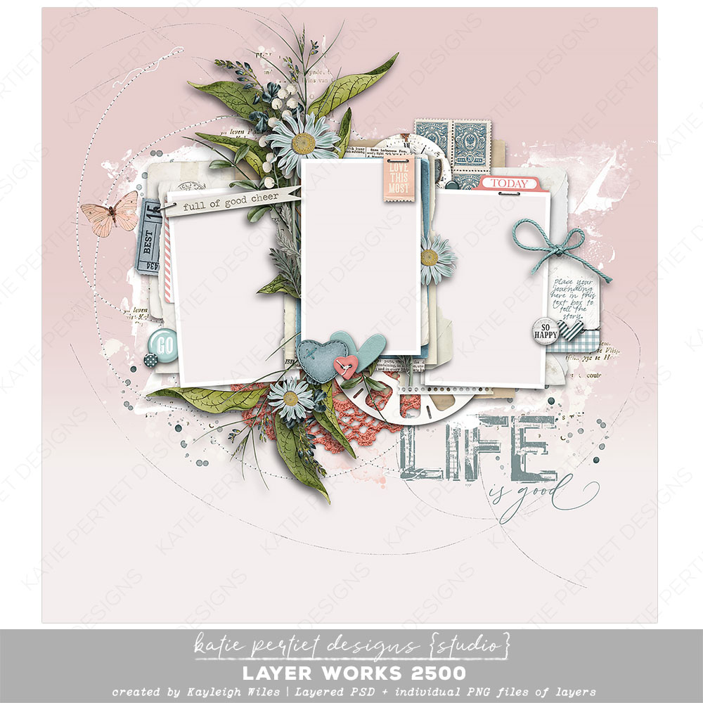 A delightful layout by Kayleigh Wiles with elements from Katie Pertiet. Packed with everything you need, it’s more of a pre-designed page than a template. Simply add your papers, photos and journaling and you’re done! Layered Adobe PSD file and individual PNGs of each layer. File Size: 100MB